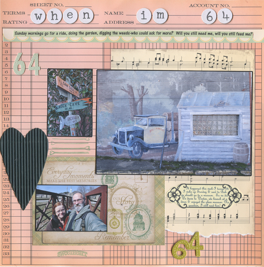 The title and words are from the Beetles song: "Sunday morning go for a ride, doing the garden, digging the weeds-who could ask for more? Will you still need me, will you still feed me? When I'm 64!"